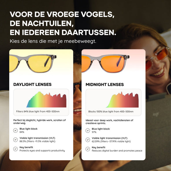 Onze blauwlichtbrillen bieden wetenschappelijk bewezen bescherming voor uw ogen en uw slaap. Ze zijn ideaal voor iedereen die veel tijd voor schermen doorbrengt, zowel overdag als 's avonds.