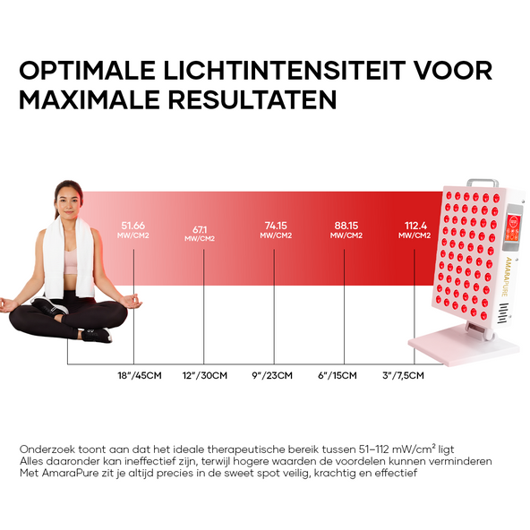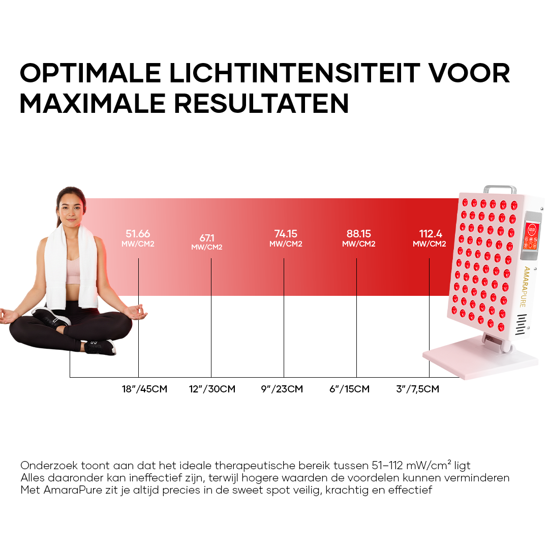 • Afstand & duur: 5–10 minuten per zone als start; bouw op naar 10–20 minuten per gebied. Houd 15–45 cm afstand volgens de handleiding. Start met 3–5 sessies per week.