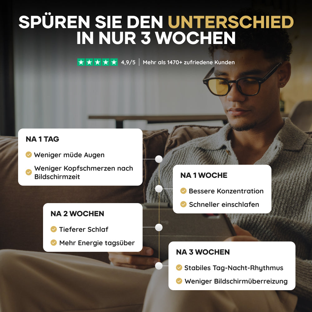 Für das Beste und langfristiges Ergebnis Verwenden Sie die Brille regelmäßig. Der tägliche Schutz gewährleistet einen optimal funktionierenden Biorhythmus und reduziert strukturell die digitale Augenbelastung.