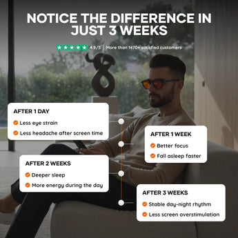 Pour des résultats optimaux et durables, portez les lunettes régulièrement. Une protection quotidienne garantit un biorythme optimal et réduit durablement la fatigue oculaire numérique.