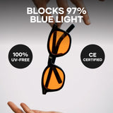 - Verres orange (nuit) : filtrent plus de 97 % de la lumière bleue. Indispensables en soirée (2 à 3 heures avant le coucher), ils bloquent efficacement la lumière qui inhibe la production de mélatonine, favorisant ainsi un sommeil optimal.
