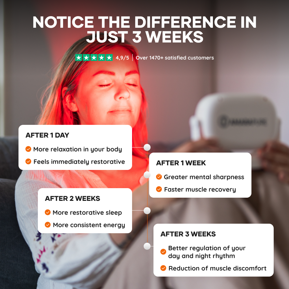 • Mer energi og bedre søvn med regelmessige økter – korte daglige behandlinger kan gjøre en forskjell.