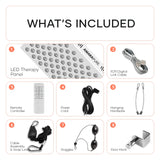 Aperçu de tous les composants fournis avec le panneau de luminothérapie LED.
