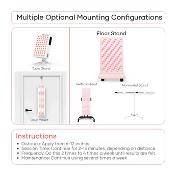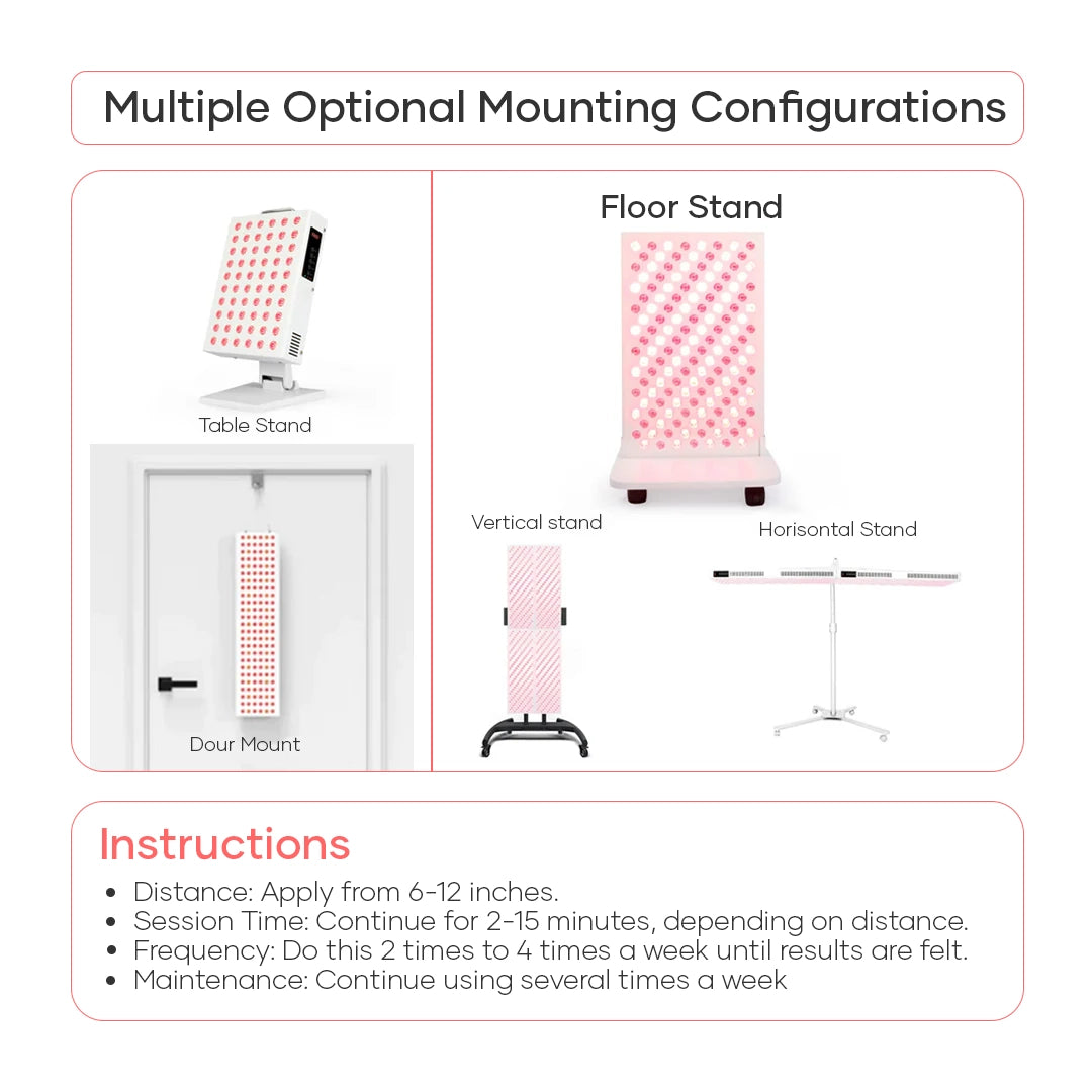 • Afstand & duur: 5–10 minuten per zone als start; bouw op naar 10–20 minuten per gebied. Houd 15–45 cm afstand volgens de handleiding. Start met 3–5 sessies per week.
