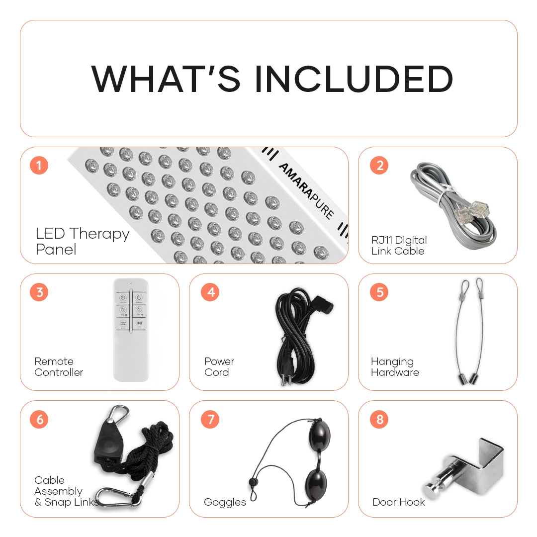 Aperçu de toutes les pièces fournies avec le panneau de thérapie LED.